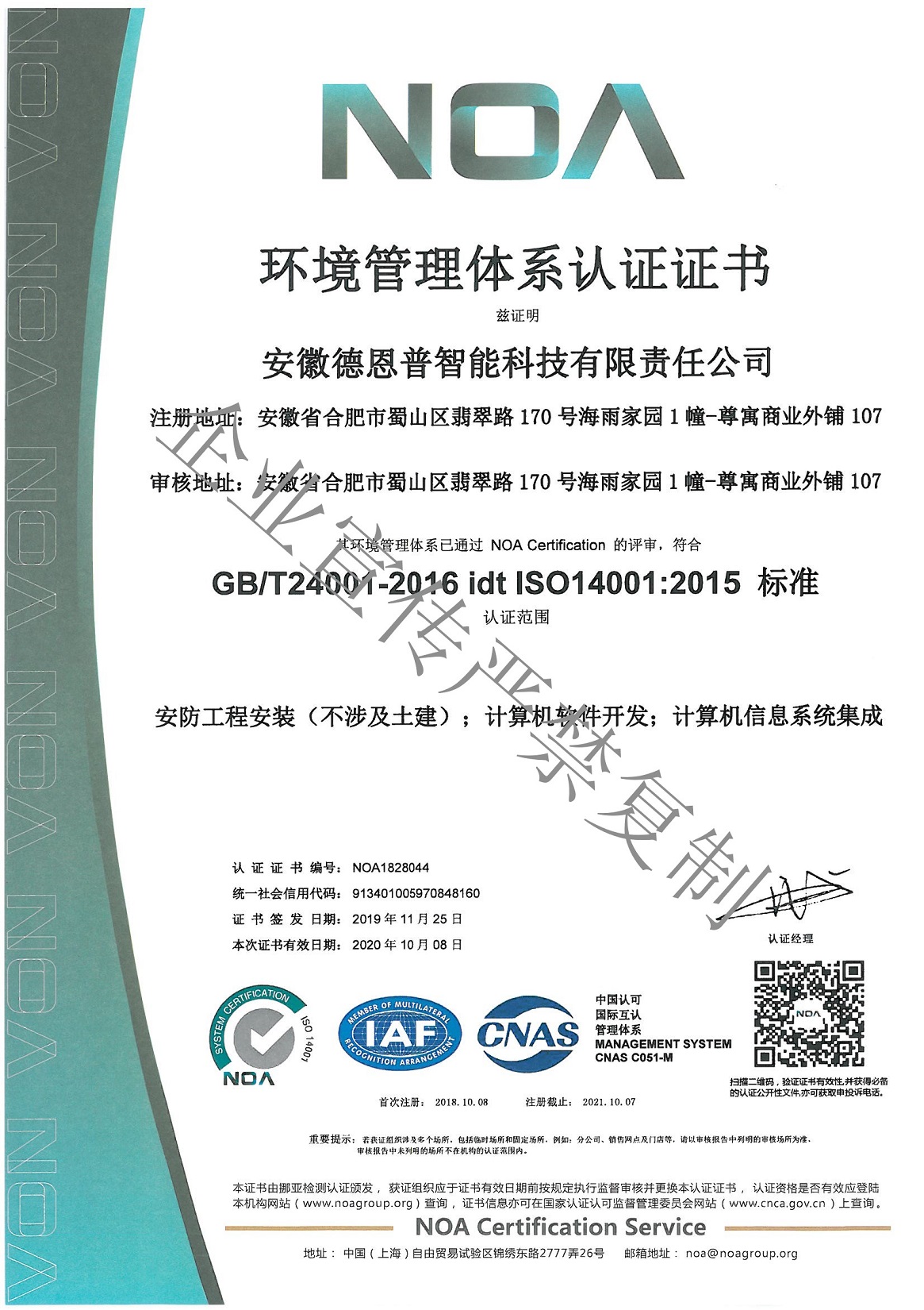 环境管理体系认证证书