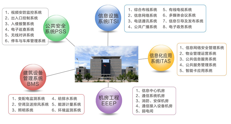 信息设施系统(ITSI)——是政府机关信息化的基础设施。是由政府机关办公的语音和数据通信、图像和广播传输的基本系统和基础设备构成。政府办公自动化系统是实现政府机关内部办公信息的收集与处理、流动与共享、实现科学决策的信息系统,目的是提供政府机关内部各部门之间计算机网络之间的信息交换和公文交流,建立高质量、高效率的信息网络,为领导决策和机关办公提供服务,实现机关办公现代化、信息资源化、传输网络化和决策科学化。会议系统和信息发布及查询系统,是政府机关内部会议、培训、新闻发布、信息传播的技术平台,是政府办公的一项重要内容,其多媒体设计要体现使用的特色性和管理便捷性。