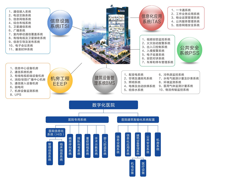 医院智能化系统主要包括:信息设施系统(ITSI)、信息化应用系统(ITAS)、建筑设备管理系统(BMS)、公共安全系统(PSS)、机房系统(EEEP)。其中信息化应用系统中的医院专用系统和信息网络安全系统最为重要。
