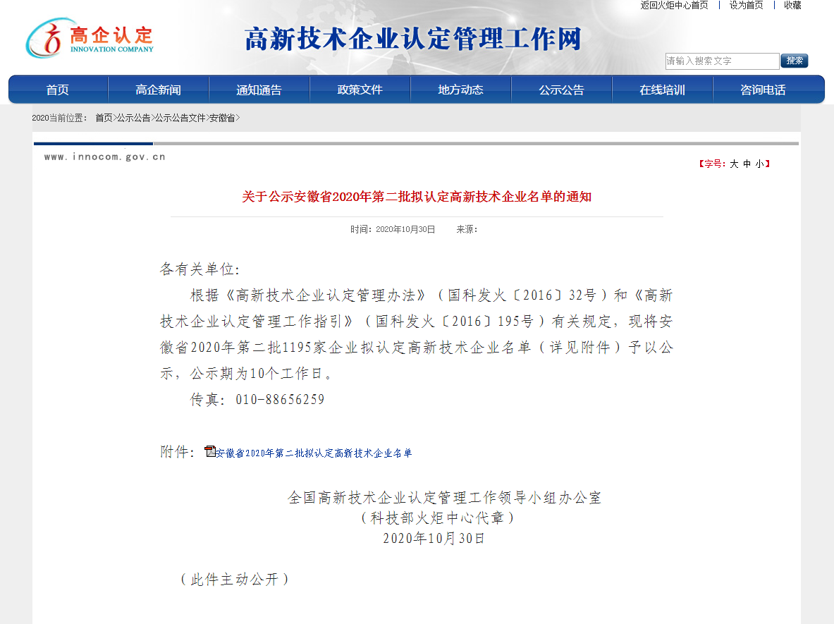 日前,高新技术企业认定管理工作网对外公布了“关于公示安徽省2020年第二批拟认定高新技术企业名单“