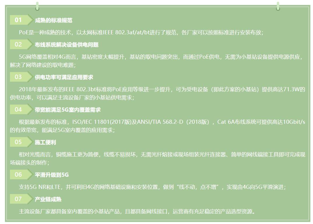 5G 应用的高清视频、AR/VR、远程医疗、工业制造自动化、现代物流管理等主要发生在建筑物室内场景,需要更高的带宽来承载。为了获取更多带宽,室内5G引入了更高的频段(C-Band和毫米波),意味着更大的传输及穿透损耗,以及更加密集的组网,采用传统的4G建网方式可能导致室内覆盖不足,高密度的小基站建设将是5G室内场景建设的必然。同时,5G时代海量的有源网络设备,将会对运维和系统的能耗管理带来新的挑战,而大量的小基站设备的取电问题将是网络建设单位必须解决的难题。