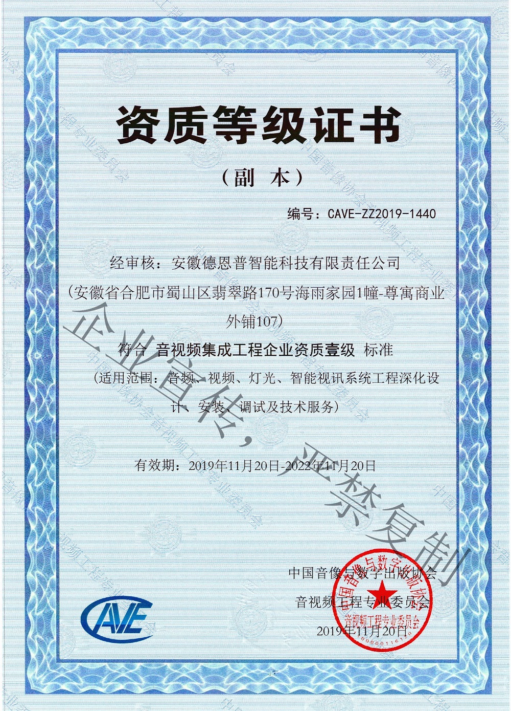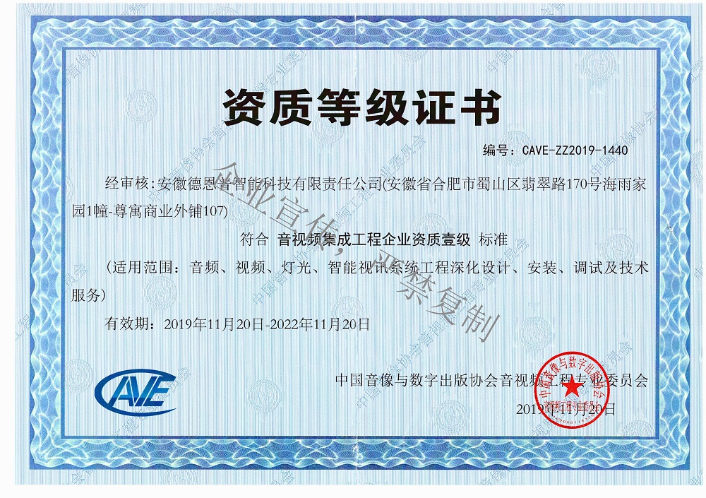 热烈庆祝我公司取得“音视频集成工程企业资质壹级”