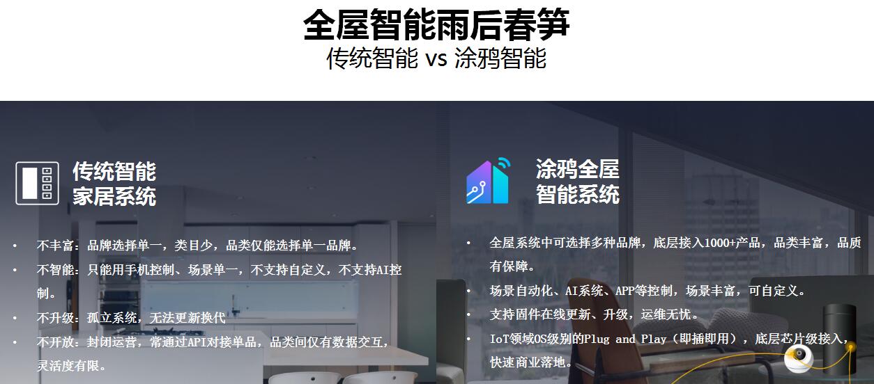 相对于传统智能家居系统,涂鸦全屋提供超90000款多品牌、多品类、高性价比的“Powered by Tuya”智能硬件,实现跨品牌互联互通。依托云端服务,支持超过200余种智能化生活场景的自由拼装。同时还提供了开放的平台集成能力和智能的设备运营能力,实现对客户数据运营,开拓全新的商业价值。